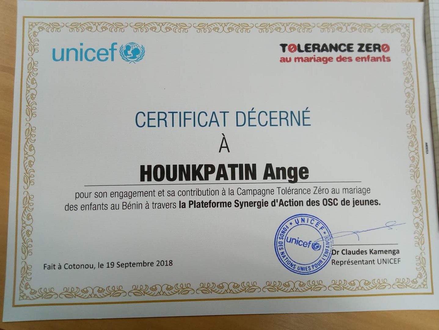 RECONNAISSANCE ET FÉLICITATIONS DE UNICEF Benin par le représentant résidant Dr Kamenga à Zadok-Ange Hounkpatin alias Aïnonvi Conteur.
